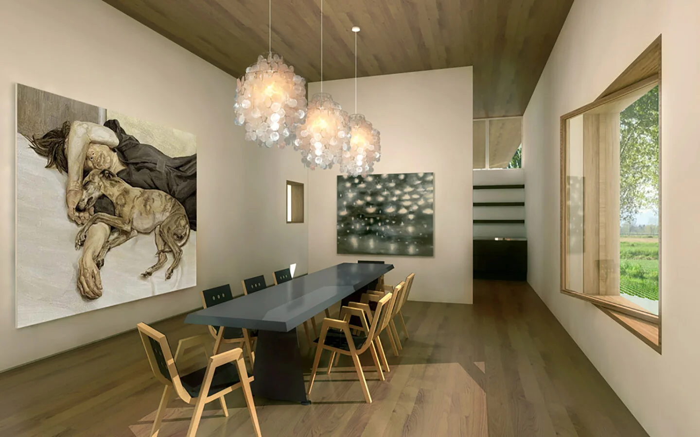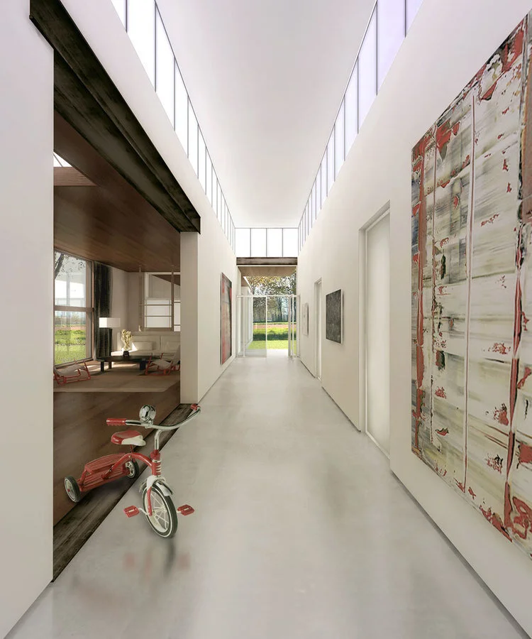 Modernism's most sacred tenets-simplicity, utility, order, rationalism, form following function—were nothing new to the Shakers who settled New York's Columbia County. This house, located in Chatham and not far from Hancock Shaker Village, therefore picks up on these parallel precedents to embrace both Shaker ideals and their natural outgrowth in the architecture of today. Here, a 16-foot entrance gallery lined with clerestory windows serves to separate principle living areas from bedrooms, while also functioning as exhibition space for a perpetually evolving collection of contemporary art and design objects. The house, raised on a concrete plinth, is clad in wood, while a separate studio showcases exterior surfaces covered in Cor-ten steel shingles. Yet the forms are unified by a continuous copper roofline. The interrelationship creates juxtapositions between urban and rural aesthetics, a sense of lofty volume grounded by humble materials and finishes, and an interplay between intimate rooms and the rolling wide-open landscape outside.