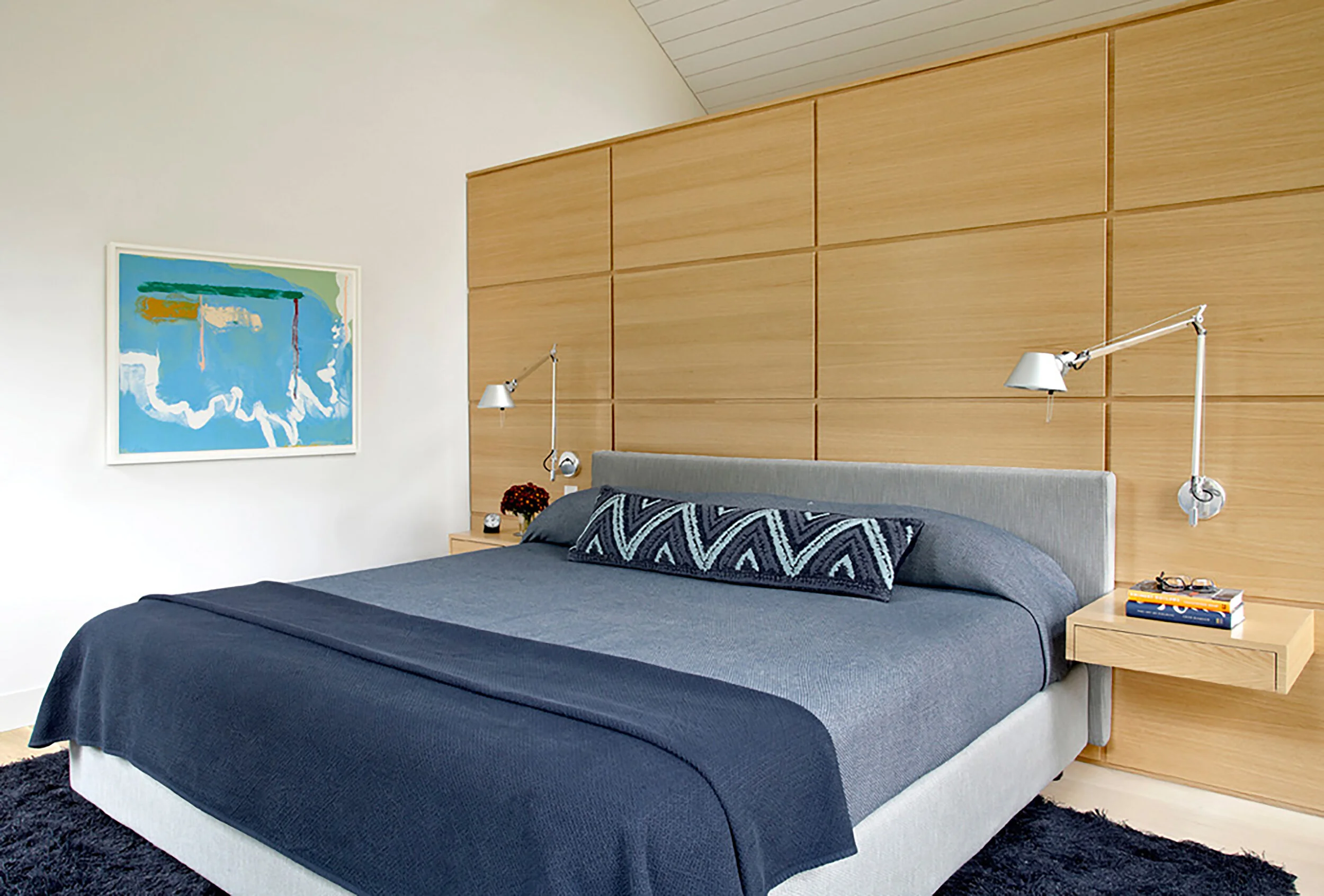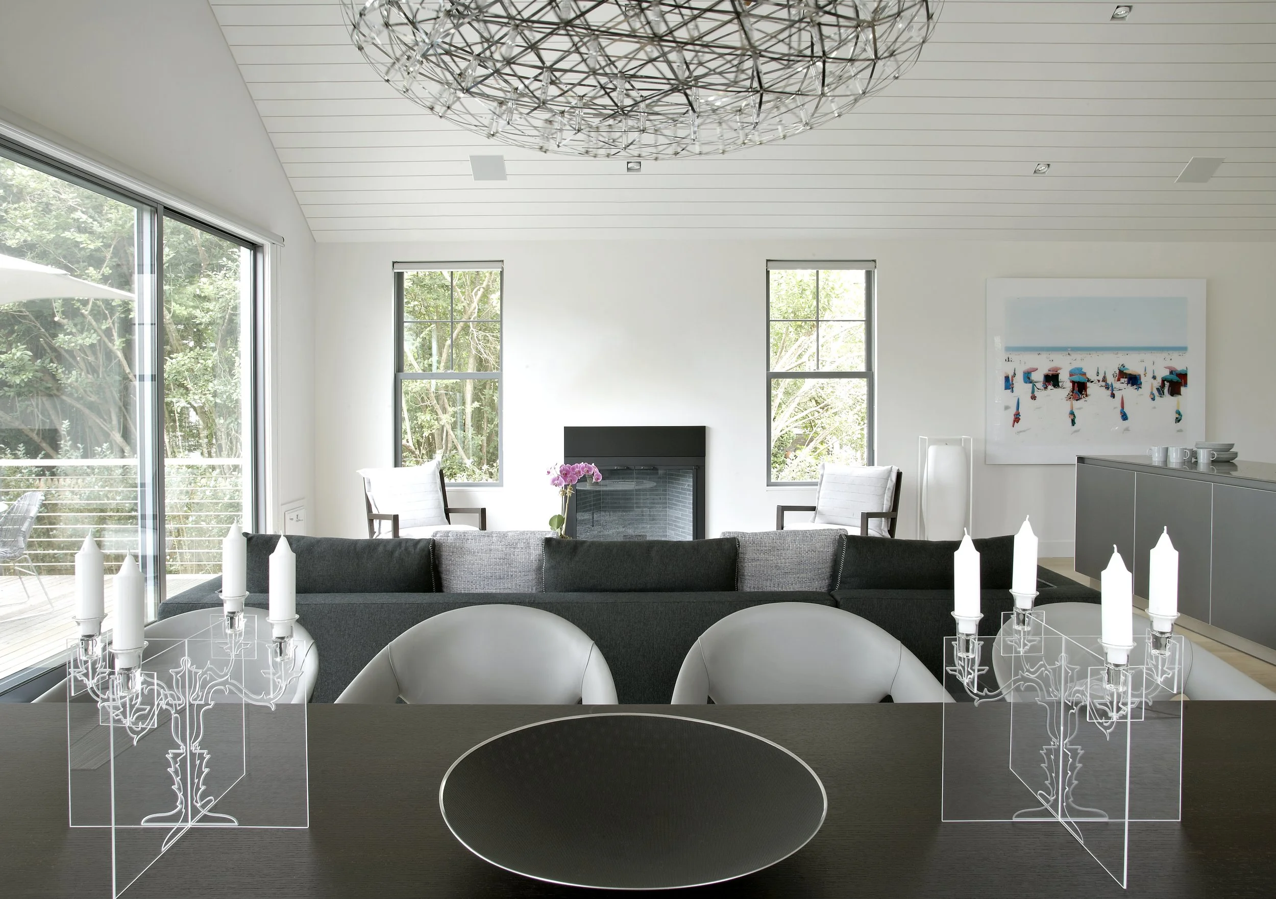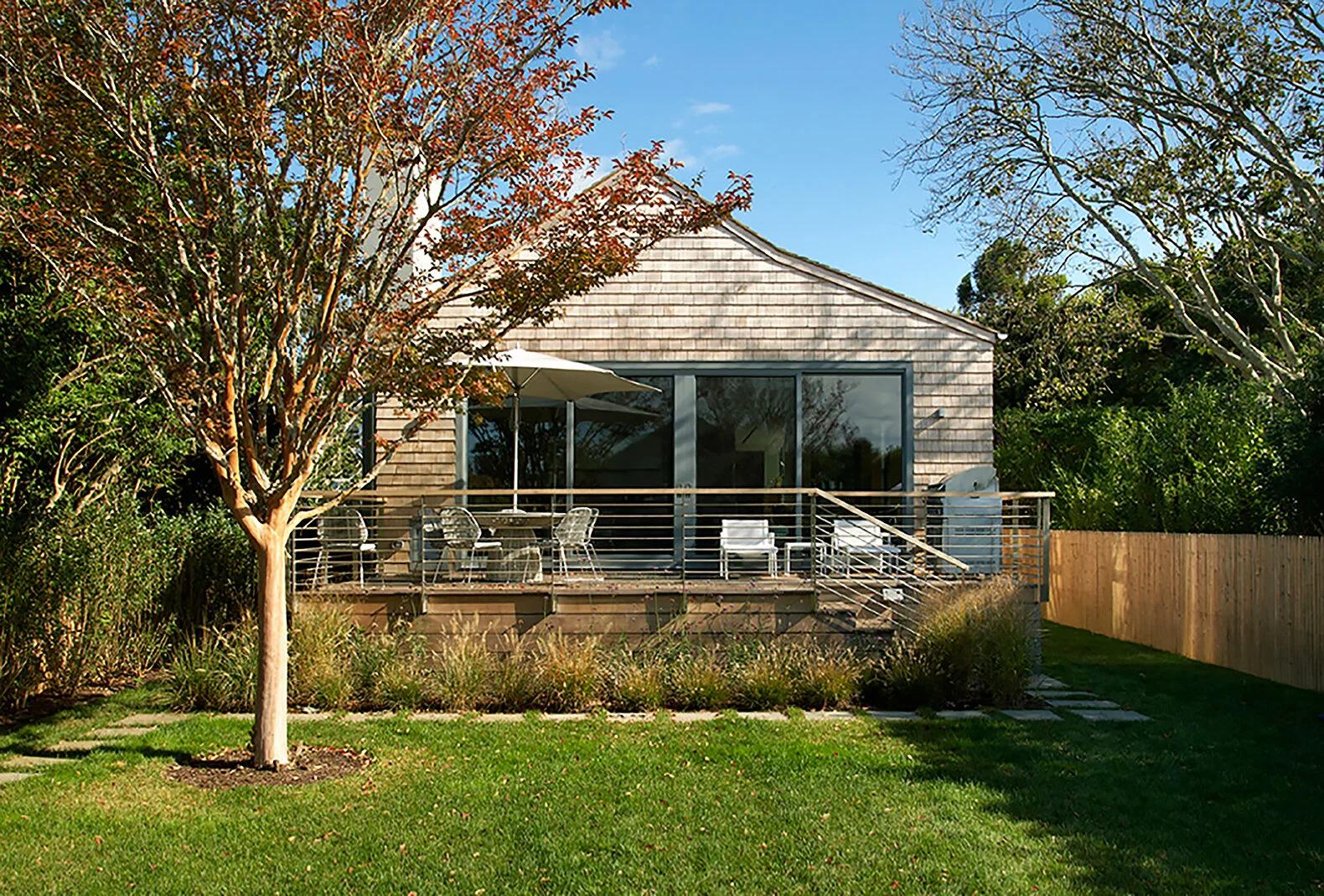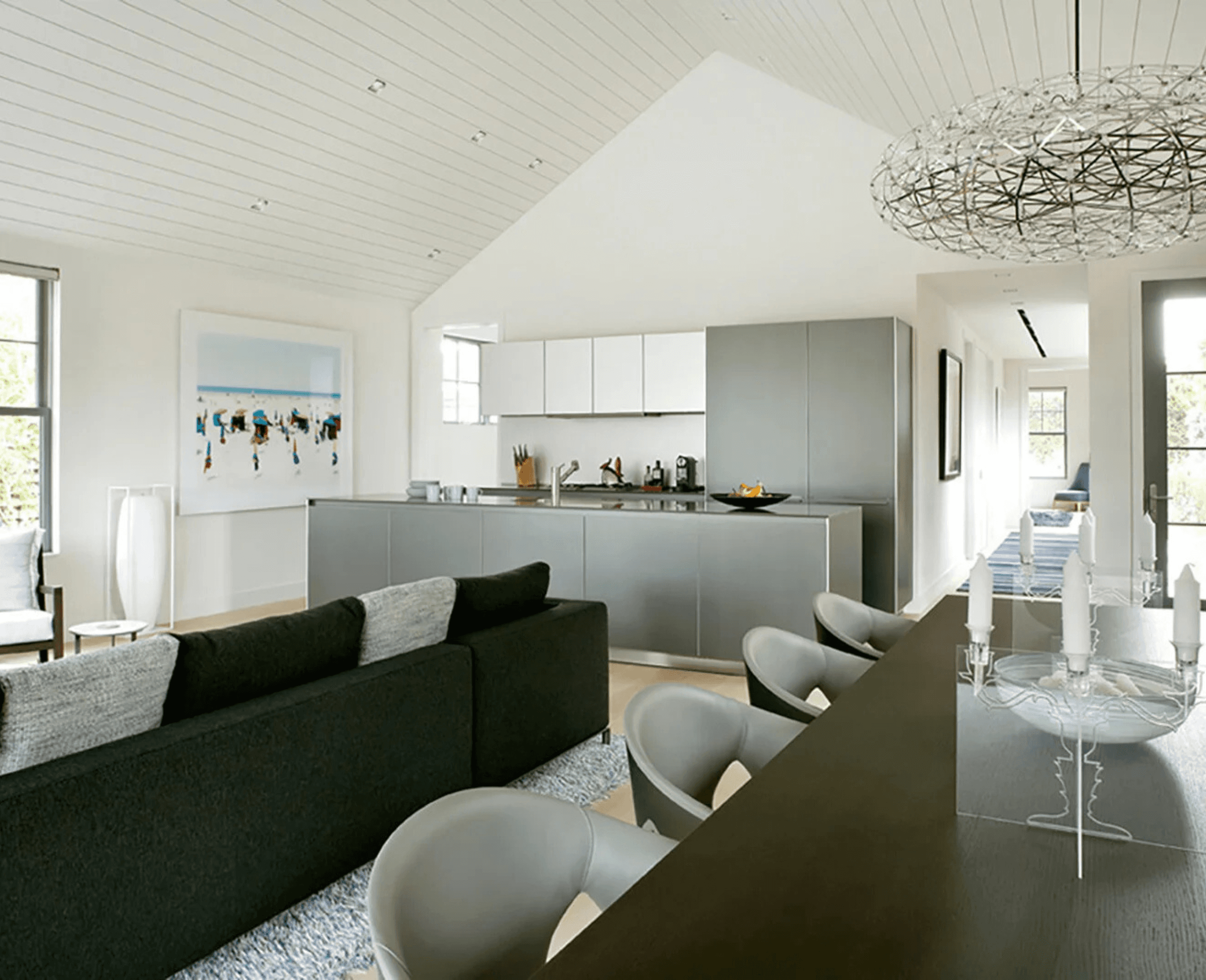 For the interiors, Axis Mundi typically decided not to play by the rules. Instead of de rigeur nautical artifacts, floppy sofas and wicker furniture, the firm responded to Makoid’s all-white interior envelope by injecting rooms with comfortable modern elegance that’s more contemporary Cap Ferrat than Eastern Long Island. Clean furniture silhouettes—from Cassina, Poltrona Frau and B&B Italia—a Massimo Vitali beach scene, a Moooi chandelier and industrial finishes (such as the steel of the fireplace surround and the anodized aluminum of a sleek Bulthaup kitchen) spark a creative tension between indoors and out. The gray palette provides a quiet backdrop for the nature outside, except for the master suite, where custom oak panels and blue shades create a reassuring warmth conducive to sleep.The exterior of what looks like a vernacular Hamptons shingle cottage is intentionally deceiving.