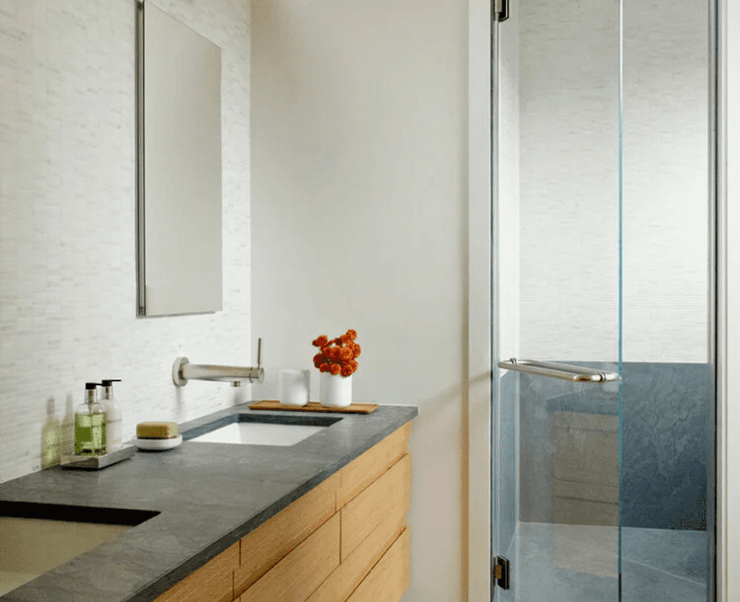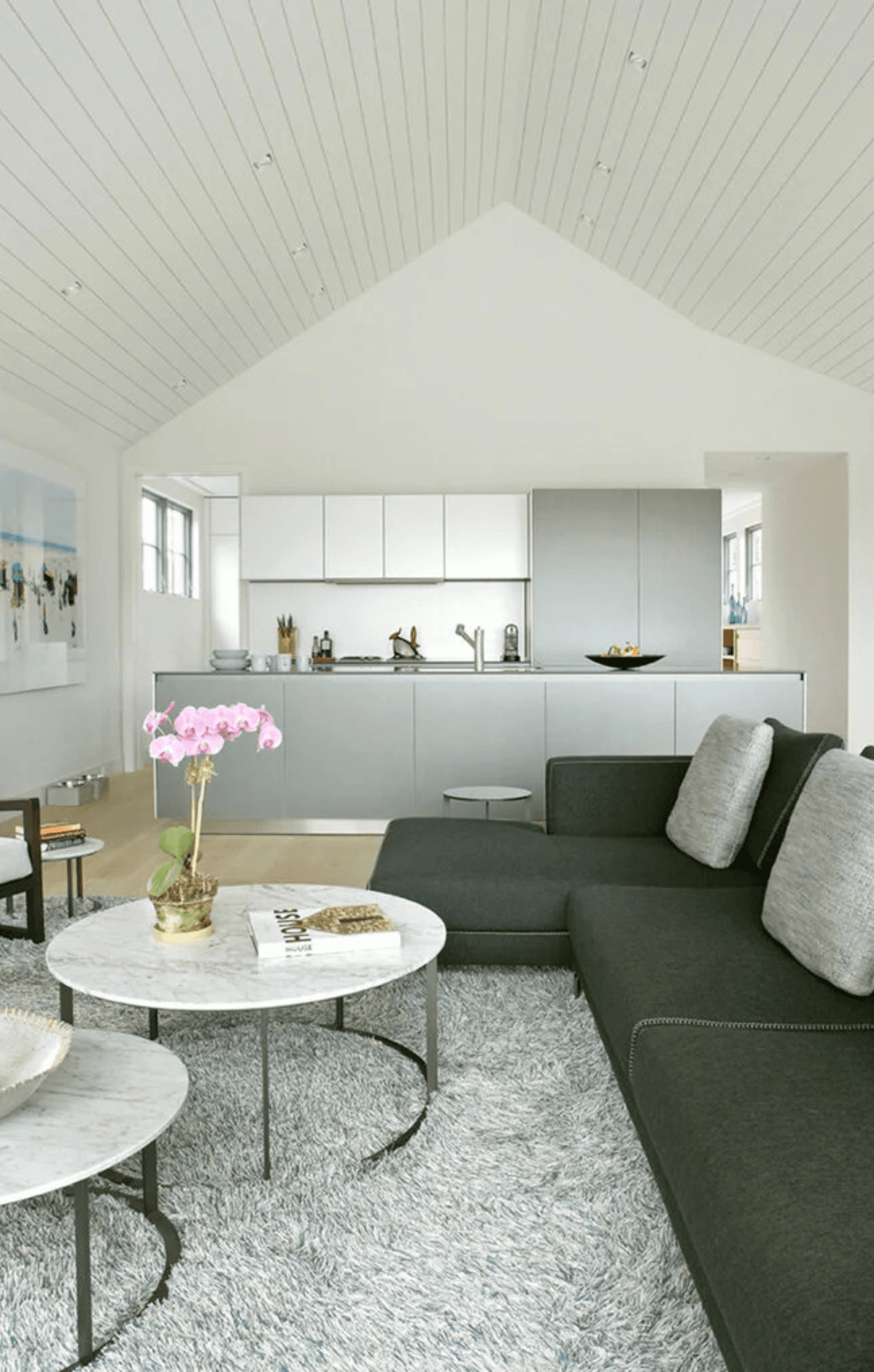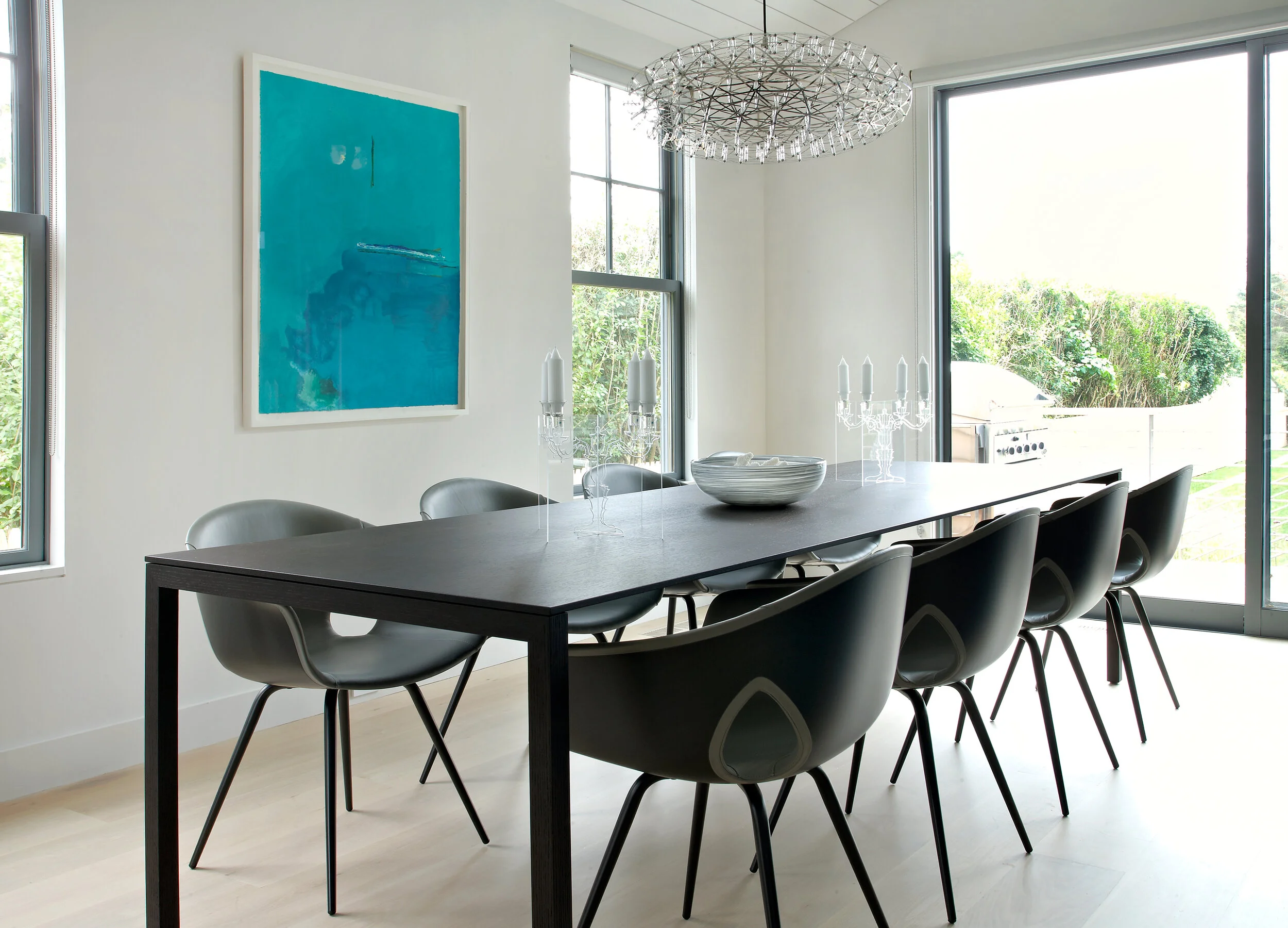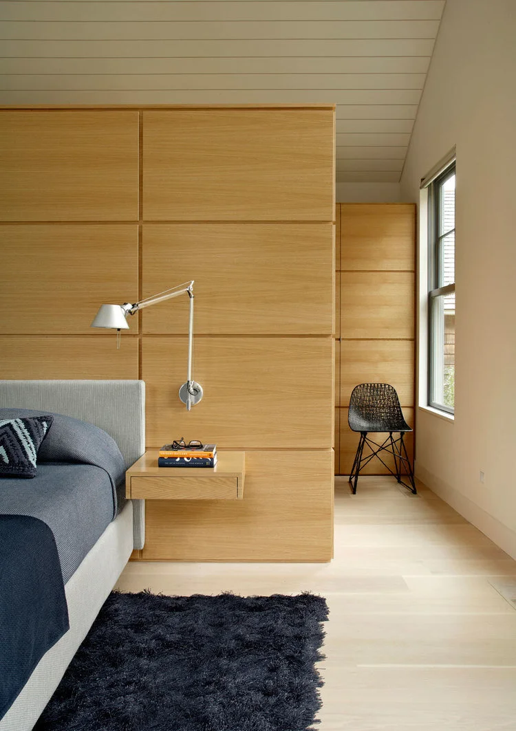 For the interiors, Axis Mundi typically decided not to play by the rules. Instead of de rigeur nautical artifacts, floppy sofas and wicker furniture, the firm responded to Makoid’s all-white interior envelope by injecting rooms with comfortable modern elegance that’s more contemporary Cap Ferrat than Eastern Long Island. Clean furniture silhouettes—from Cassina, Poltrona Frau and B&B Italia—a Massimo Vitali beach scene, a Moooi chandelier and industrial finishes (such as the steel of the fireplace surround and the anodized aluminum of a sleek Bulthaup kitchen) spark a creative tension between indoors and out. The gray palette provides a quiet backdrop for the nature outside, except for the master suite, where custom oak panels and blue shades create a reassuring warmth conducive to sleep.The exterior of what looks like a vernacular Hamptons shingle cottage is intentionally deceiving.